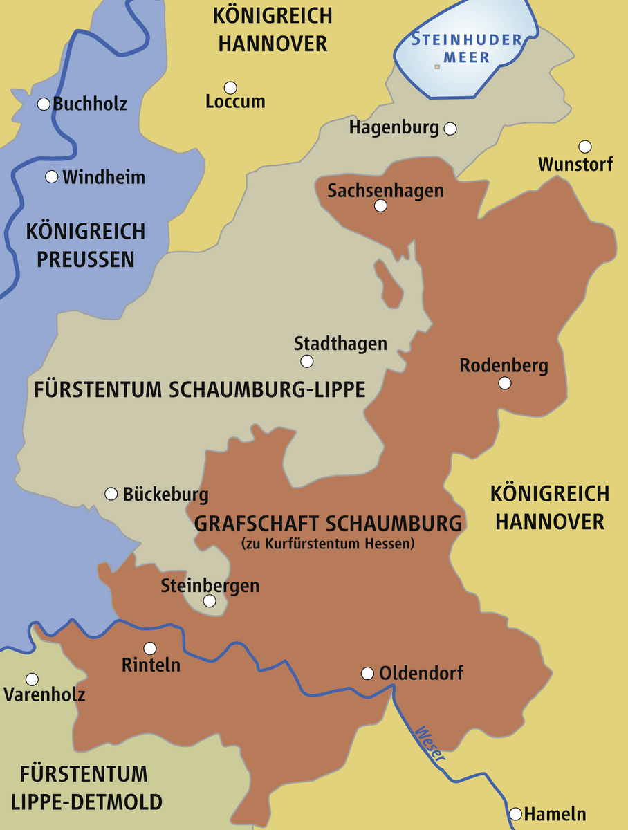 In der kleinen Grafschaft an der Oberweser regierte die Familie noch zwei Jahrhunderte weiter. 1558 führte sie die Reformation ein, und 1619 wurde Graf Ernst III. von Kaiser Ferdinand II. in den Reichsfürstenstand erhoben. Dieser Ernst III. verlegte 1621 das „Gymnasium illustre“ von Stadthagen nach Rinteln und erhob es zur protestantischen Universität seines kleinen Landes. Schon 1640 starben dann auch im Stammland an der Oberweser die Schaumburger aus. Die Mutter des letzten Grafen gehörte der Familie zur Lippe an, sie vermachte das kleine Fürstentum ihrem Bruder Grafen Philipp zur Lippe. Da mischten sich der Herzog von Braunschweig-Lüneburg (bald Hannover) und der Landgraf von Hessen-Kassel ein. Der Westfälische Friede brachte in dem Erbstreit die Lösung: aus einem großen Teil des Erbes entstand Schaumburg-Lippe mit der Hauptstadt Bückeburg. Einen kleinen Teil bekamen die Welfen, und der Rest, der sich vom Süden des Steinhuder Meeres (Sachenhagen) bis über die Weser mit Einschluss Rintelns, Hessisch-Oldendorfs und des Stammschlosses erstreckte und den alten Namen Grafschaft Schaumburg behielt, kam an den Landgrafen von Hessen-Kassel. Als nach dem Krieg von 1866 die preußische Provinz Hessen-Nassau gebildet wurde, blieb das Ländchen an der Oberweser als Exklave im Verband dieser neuen Provinz, jetzt mit den Hauptorten Rinteln und Obernkirchen. 1932 trat die gegebene Vereinfachung dadurch ein, dass der hessische Kreis Grafschaft Schaumburg, der ja von fremden Ländern und Verwaltungsbezirken eingeschlossen war, von Schaumburg-Lippe, Westfalen, Lippe-Detmold und vor allem von der Provinz Hannover, diesen eingegliedert wurde. Die hessische Zeit hatte nach zwei Jahrhunderten ein Ende gefunden.