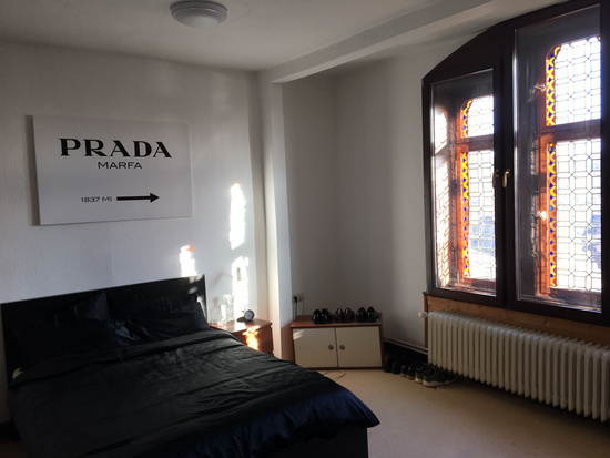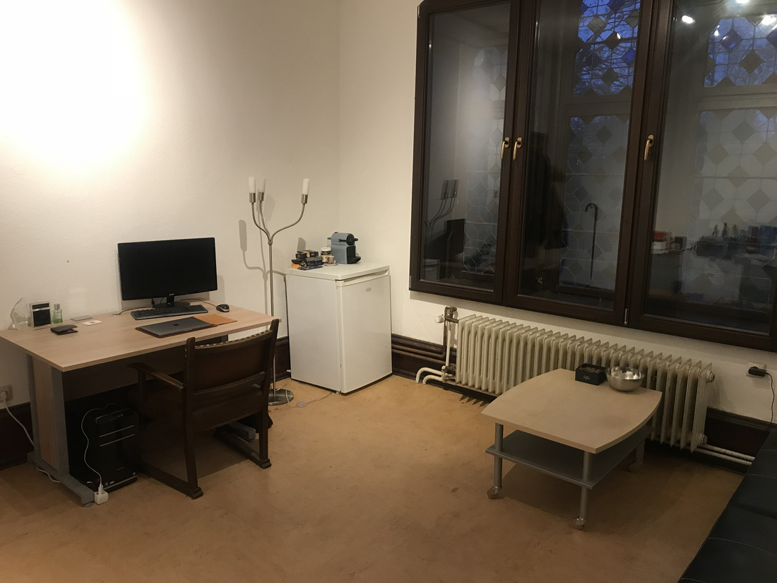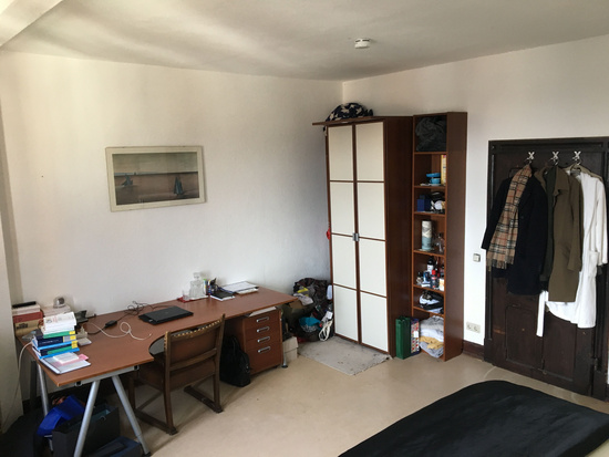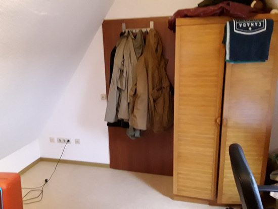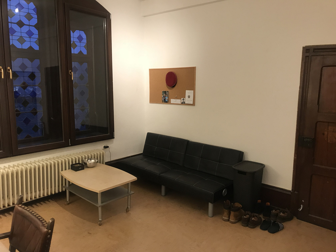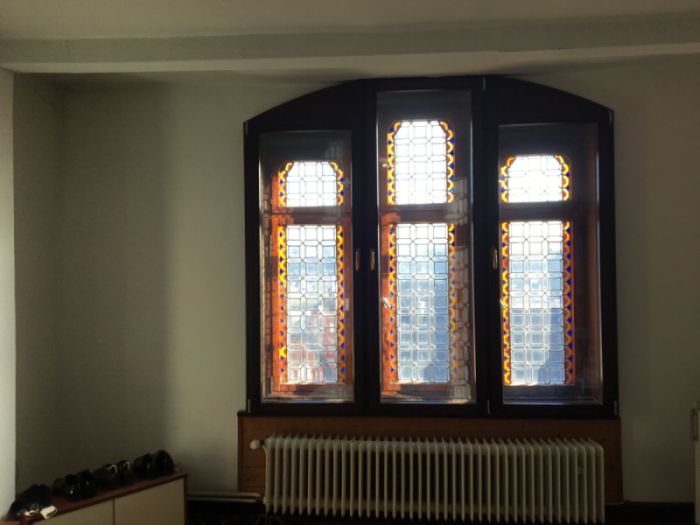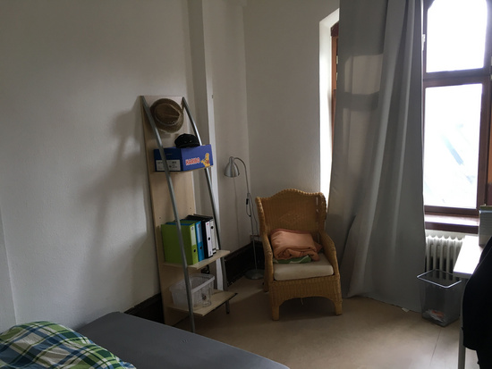 Das Zimmer liegt im zweiten Stock, Mitte. Eines der schönsten Zimmer mit einer über zwei Meter breiten Fensterfront nach Süden. Durch die drei alten orange-rot und blau verzierten Buntglasfenster sieht man nicht nur „über die Dächer Marburgs“, sondern bis zum Horizont über das Lahntal und hinauf zu den angrenzenden Bergen. Das Zimmer ist 20,5 qm groß, hell, modern möbliert und mit Telefon- und DSL-Anschluss ausgestattet. Bad und WC befinden sich im angrenzenden Flur.