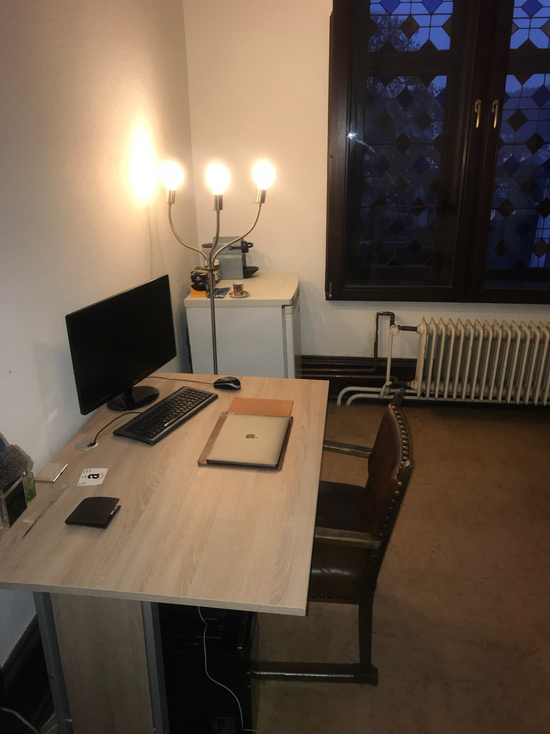 Schaumburg: 2. Stock, links. Das größte Zimmer besteht aus zwei separaten Räumen: Ein Schlafraum und ein Arbeits-/Wohnraum. Im Wohnraum zeigt die zwei Meter breite Buntglas-Fensterseite nach Osten und bietet einen herrlichen Ausblick über Marburg bis hinauf zum Ausflugsort „Spiegelslust“. Durch das kleine Bleiglasfenster im Schlafraum sieht man nach Süden über die Stadt. Das Doppelzimmer ist 25 qm groß, hell, modern möbliert und mit Telefon- und DSL-Anschluss ausgestattet. Bad und WC sind nur fünf Meter entfernt.
