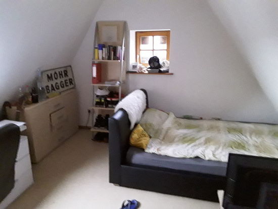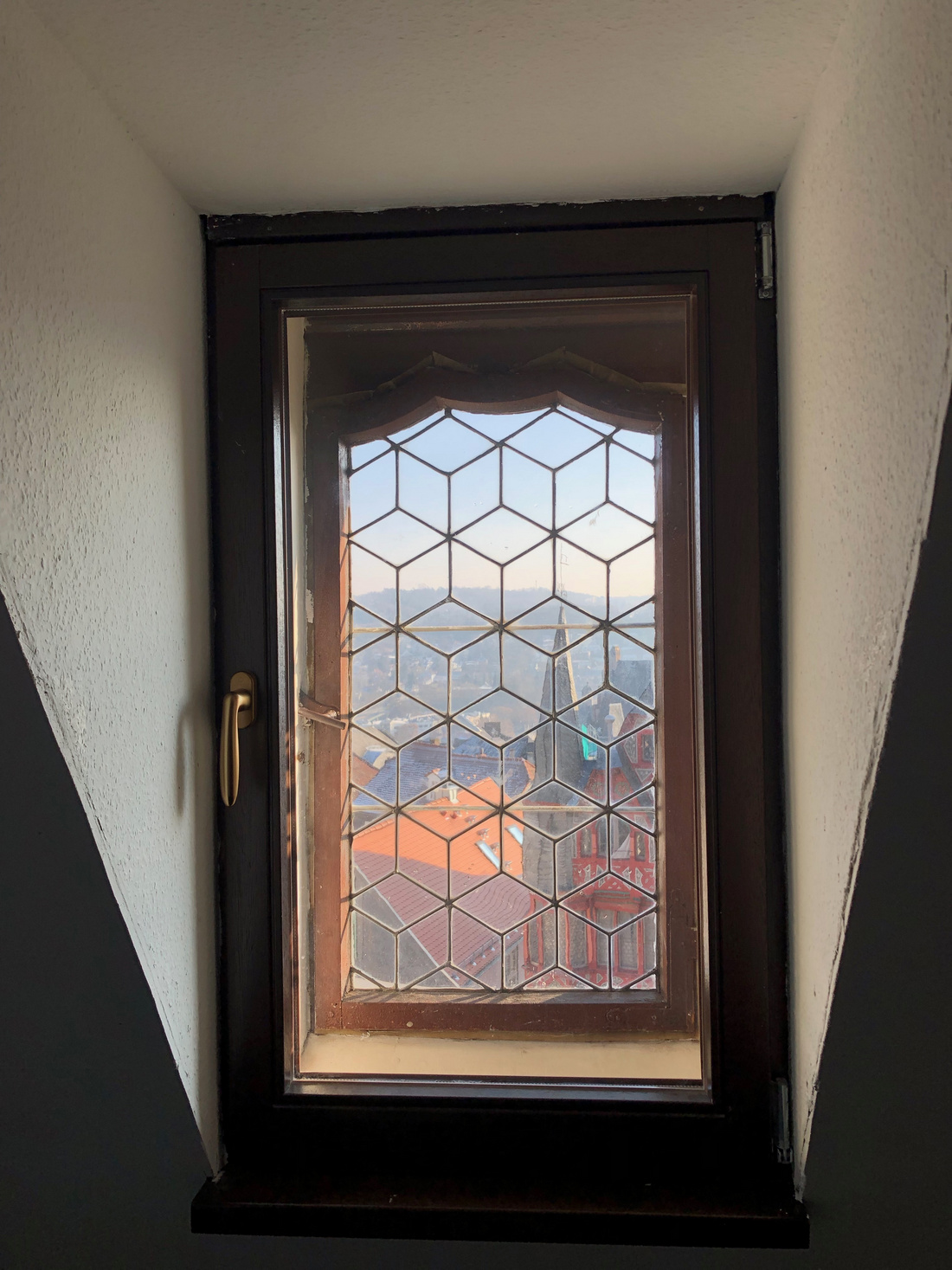 Zweiter Stock, rechts. Die zwei Meter breite Fensterfront dieses Zimmers zeigt nach Südwesten. Der Blick fällt auf die verwinkelten Fachwerkhäuser der Nachbarschaft mit Schieferplatten-gedeckten Dächern und einen außergewöhnlich krummen Glockenturm der Lutherischen Kirche. Das Zimmer ist 16 qm groß, hell, modern möbliert und mit Telefon- und DSL-Anschluss ausgestattet. Bad und WC sind direkt nebenan.