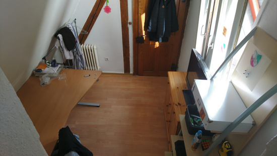 Das Zimmer befindet sich im zweiten Stock im Turm, hinten. Über eine im Zimmer gelegene 3-stufige Treppe gelangt man von dem unteren in den oberen Teil dieses Doppelzimmers. Das kleine Bleiglasfenster des höheren Zimmerteils zeigt nach Süden über Marburg, das große Doppelfenster der unteren Zimmerhälfte nach Norden mit Blick zum Schloss hinauf. Auch hier bietet sich eine Raumaufteilung als Schlafraum und Arbeits-/Wohnraum an. Das „Doppel“zimmer ist 15,5 qm groß, hell, modern möbliert und mit Telefon- und DSL-Anschluss ausgestattet. Bad und WC sind direkt nebenan.